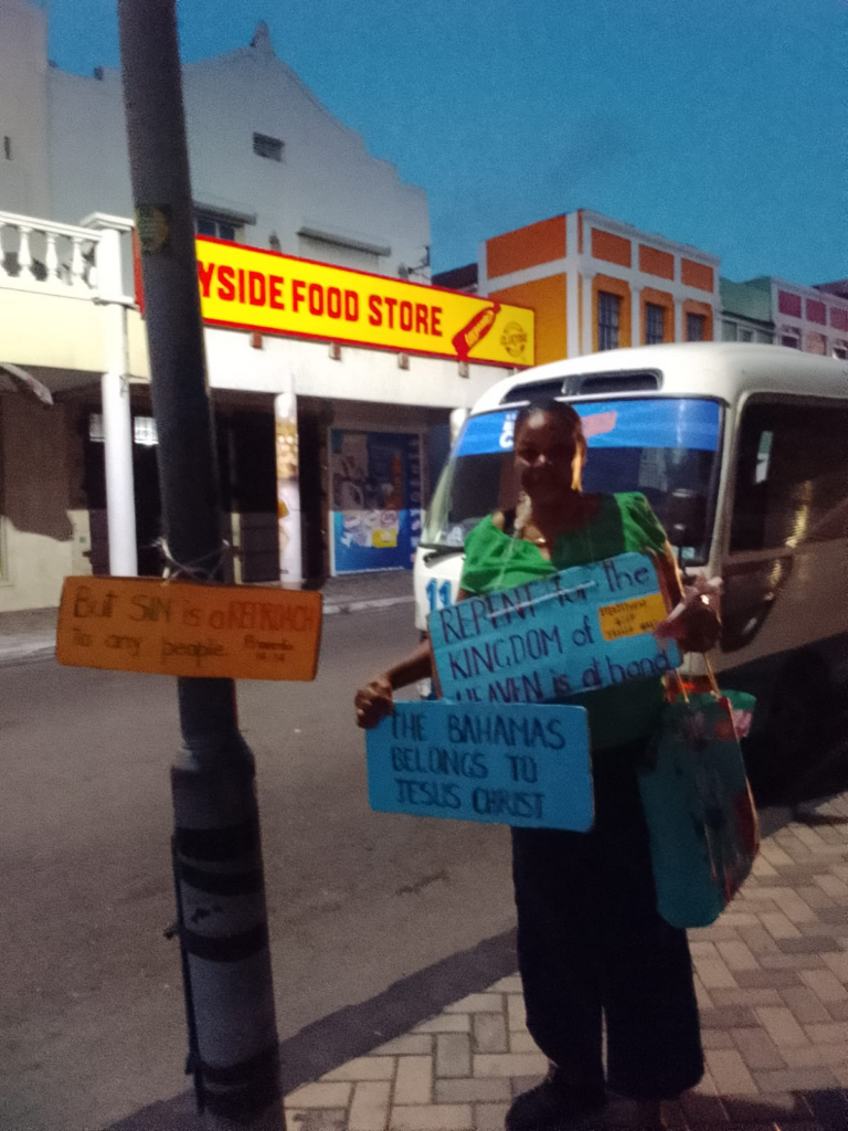 “I took the ministry; I took the prayer protest to The Bahamas, and from the kick-off, people gravitated toward it. Some will look, some will toot their horns, people will stop; sometimes somebody will give a donation, somebody will say, ‘Well done, I appreciate what you are doing,’” she shared with Freedom Come Rain.