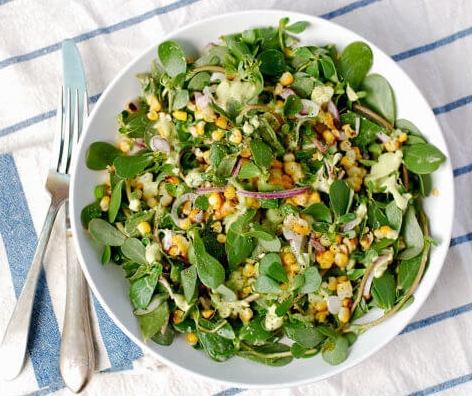 Purslane Salad With Grilled Corn, Red Onion, and a Creamy Avocado Dressing