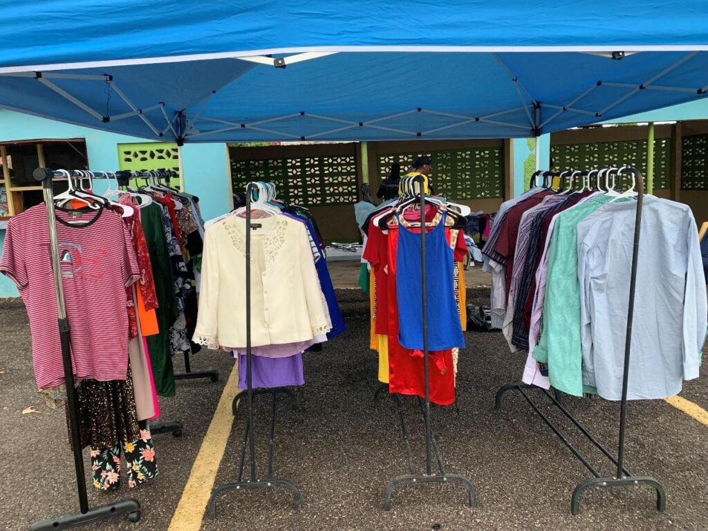In order to control the huge crowd that generally gathers on the church compound hoping to collect a package, senior citizens and other residents from the community were contacted ahead of time and told when to come and collect their packages. Many stayed behind to look through and select from racks of clothes that were being given away.