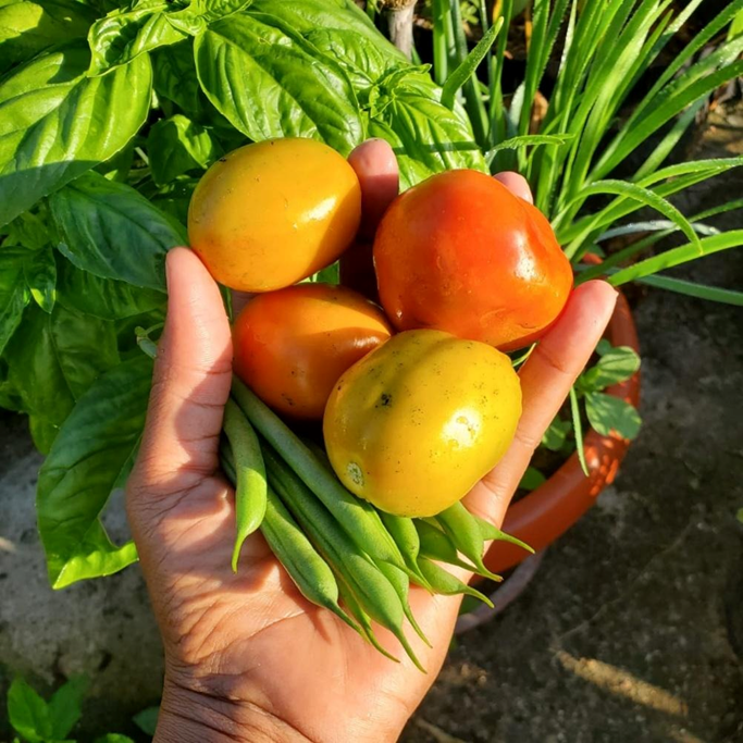 Mostly a container gardener, she has three in-ground garden beds, plus various sizes of containers with cabbage, callaloo, tomato, cucumber, turmeric, ginger, pak choy, curled kale, carrot, string beans, okra, Irish potato, sweet potato, sweet corn, beetroot, turnip, lemon, June plum, dragon fruit, Jerusalem peas and garlic chives. Malabar spinach and cowpeas are trellised on the fence along a wall.