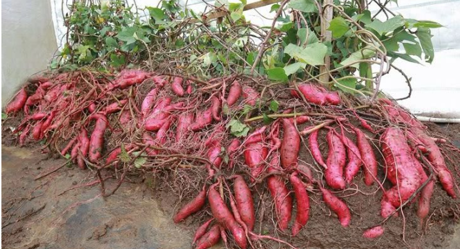 Instead of the traditional flat beds, we planted sweet potatoes in horizontal grow bags, trained the vines upward on a simple trellis, and let the tubers develop inside a controlled soil column.